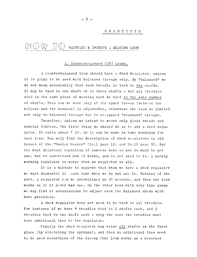 Shortcuts - How To Maintain & Improve a Weaving Loom, ---. Master Weaver, No. 42 November 1958, 5 pages. Note: PDF provided by Judith Combs. By permission. Posted July 15, 2006. SAMPLE PAGE. File size 770 KB PDF
