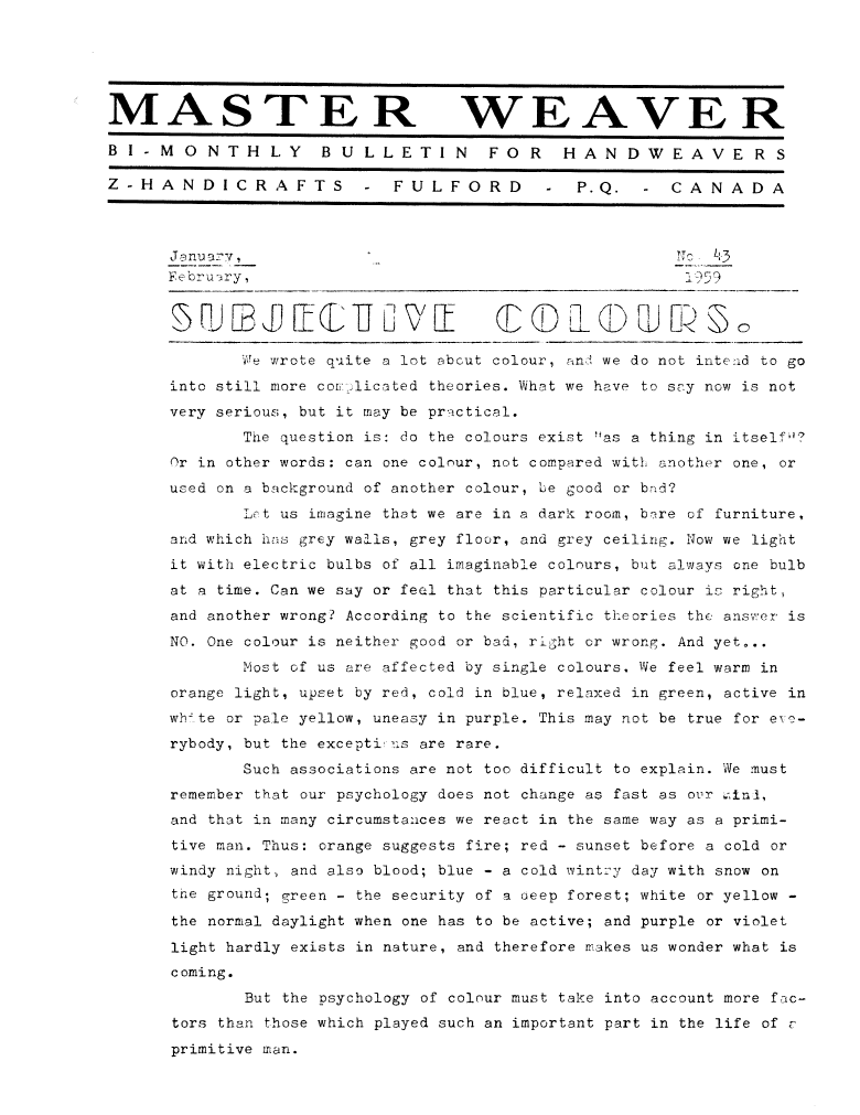 Subjective Colours, ---. Master Weaver, No. 43 January 1959, 3 pages. Note: PDF provided by Judith Combs. By permission. Posted July 15, 2006. SAMPLE PAGE. File size 654 KB PDF