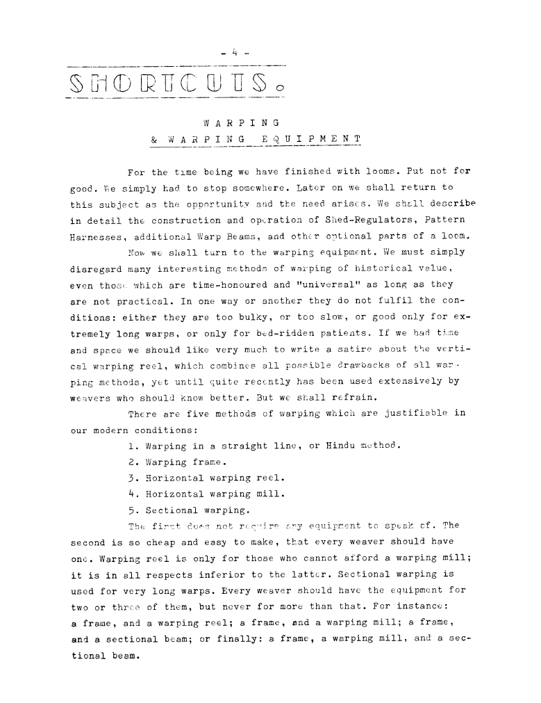 Shortcuts - Sectional Warping, ---. Master Weaver, No. 44 March 1959, 4 pages. Note: PDF provided by Judith Combs. By permission. Posted July 15, 2006. SAMPLE PAGE. File size 685 KB PDF