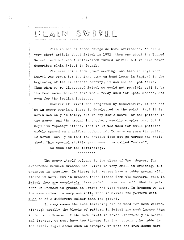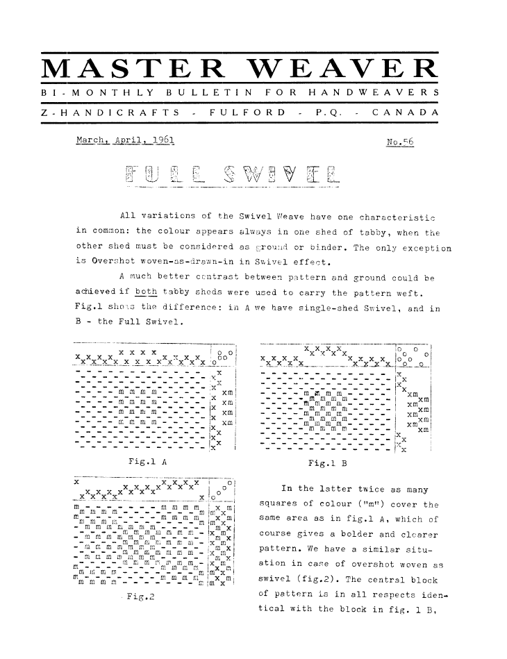 Full Swivel, ---. Master Weaver, No. 56 March 1961, 5 pages. Note: PDF provided by Judith Combs. By permission. Posted July 15, 2006. SAMPLE PAGE. File size 695 KB PDF