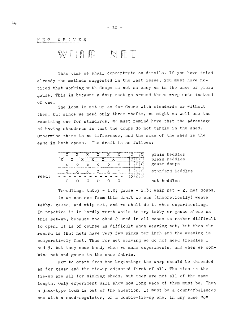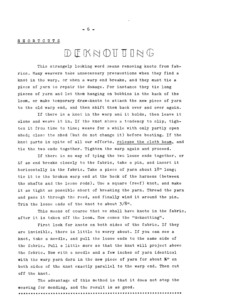 Shortcuts - Deknotting, ---. Master Weaver, No. 54 November 1960, 1 page. Note: PDF provided by Judith Combs. By permission. Posted July 15, 2006. SAMPLE PAGE. File size 462 KB PDF