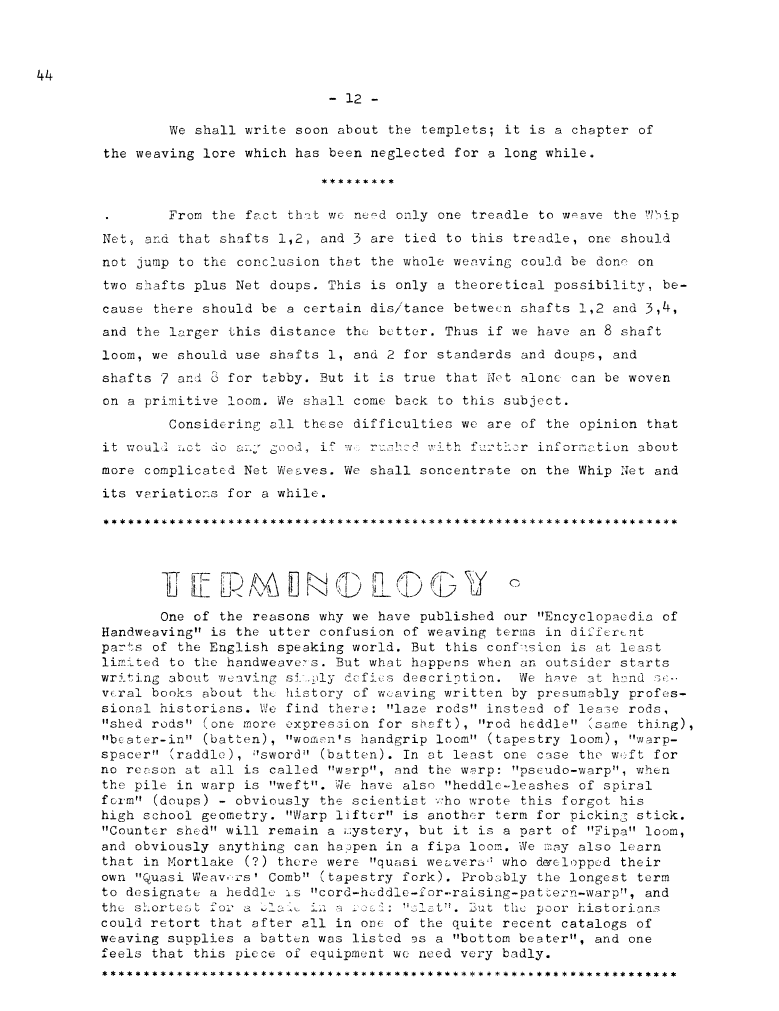 Terminology, ---. Master Weaver, No. 44 March 1959, 1 page. Note: PDF provided by Judith Combs. By permission. Posted July 15, 2006. SAMPLE PAGE. File size 501 KB PDF