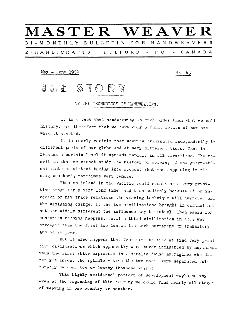 The Story of the Technology of Weaving, ---. Master Weaver, No. 45 May 1959, 3 pages. Note: PDF provided by Judith Combs. By permission. Posted July 15, 2006. SAMPLE PAGE. File size 626 KB PDF