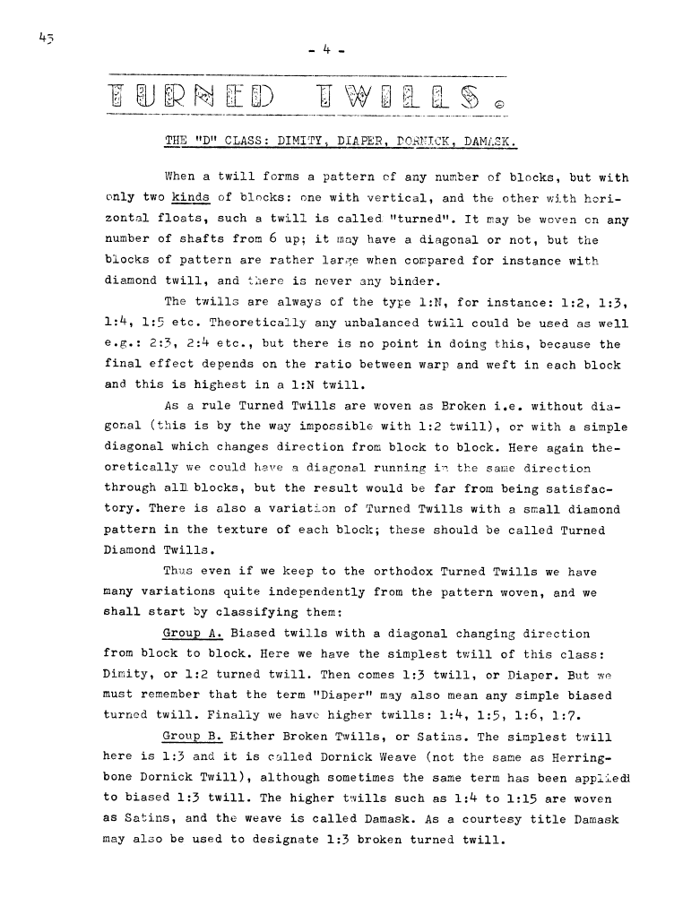 Turned Twills - The ""D"" Class: Dimity, Diaper, Dornick, Damask, ---. Master Weaver, No. 45 May 1959, 4 pages. Note: PDF provided by Judith Combs. By permission. Posted July 15, 2006. SAMPLE PAGE. File size 665 KB PDF