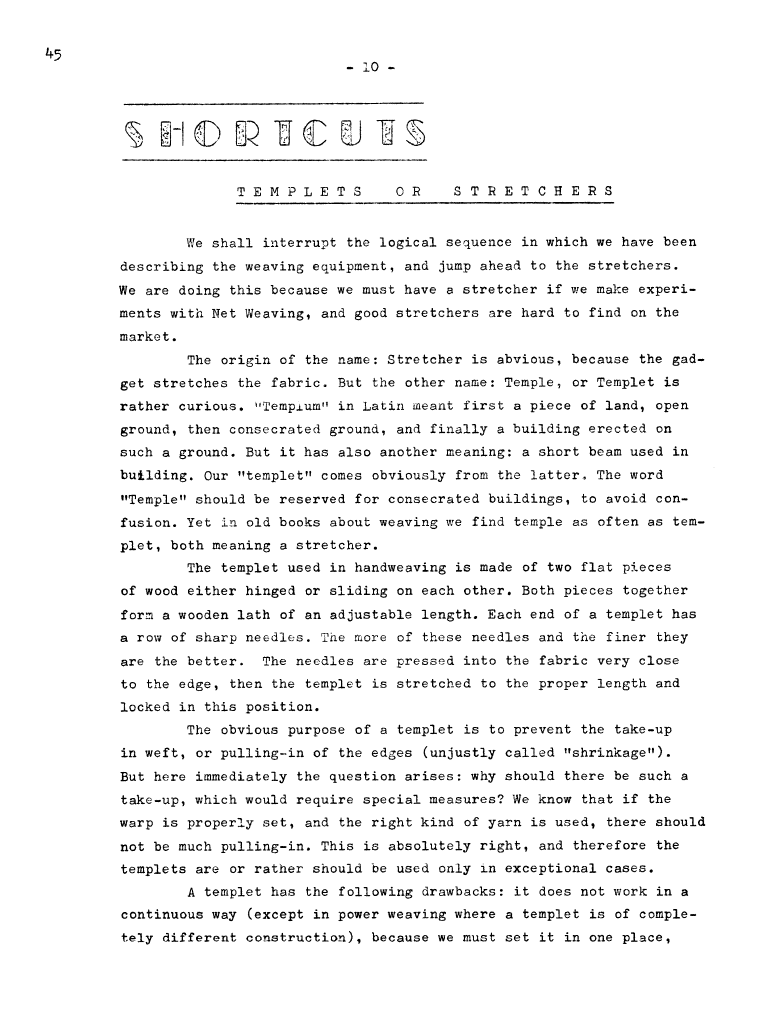 Shortcuts - Templets or Stretchers, ---. Master Weaver, No. 45 May 1959, 3 pages. Note: PDF provided by Judith Combs. By permission. Posted July 15, 2006. SAMPLE PAGE. File size 606 KB PDF
