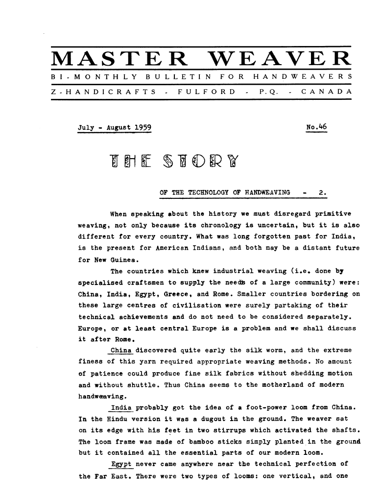 The Story of the Technology of Weaving 2, ---. Master Weaver, No. 46 July 1959, 4 pages. Note: PDF provided by Judith Combs. By permission. Posted July 15, 2006. SAMPLE PAGE. File size 709 KB PDF