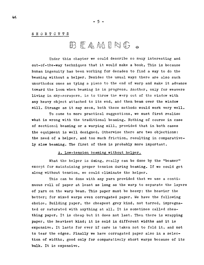 Shortcuts - Beaming, ---. Master Weaver, No. 46 July 1959, 3 pages. Note: PDF provided by Judith Combs. By permission. Posted July 15, 2006. SAMPLE PAGE. File size 636 KB PDF