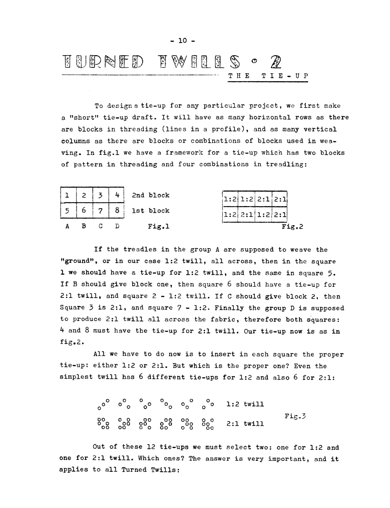 Turned Twills 2 - The Tie-up, ---. Master Weaver, No. 46 July 1959, 3 pages. Note: PDF provided by Judith Combs. By permission. Posted July 15, 2006. SAMPLE PAGE. File size 623 KB PDF