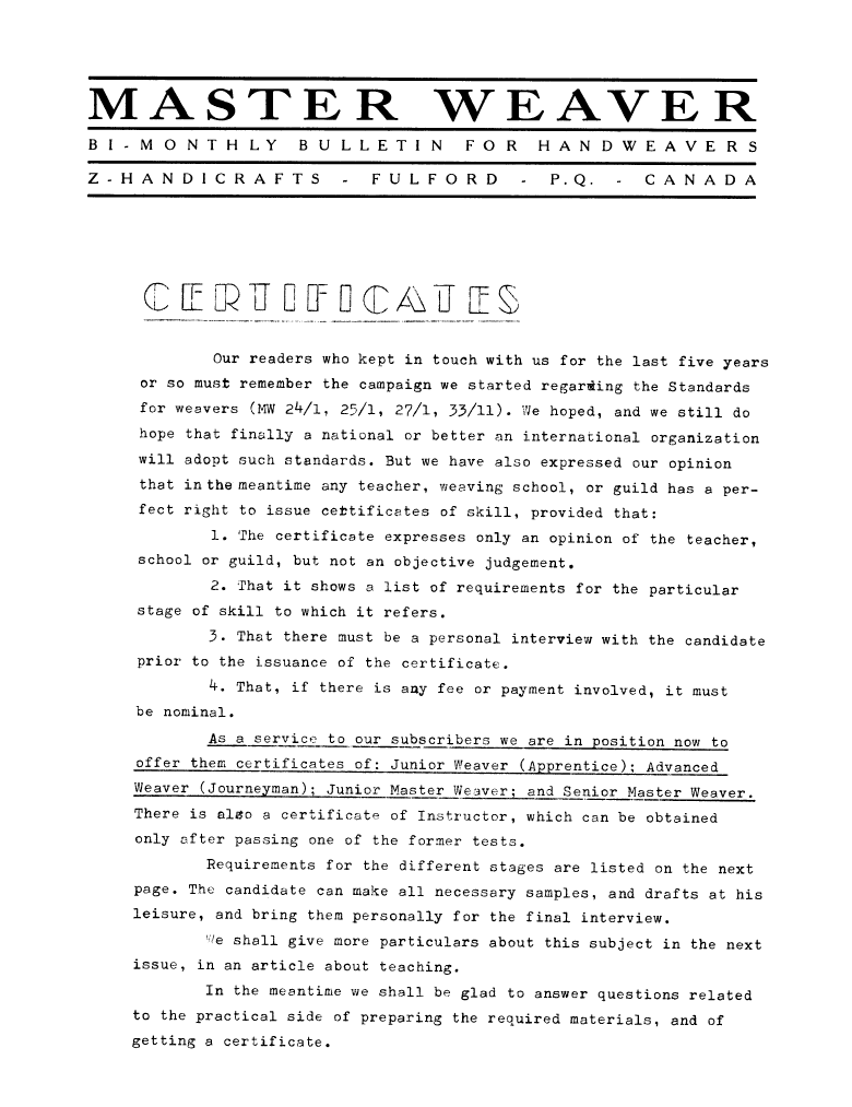 Certificates, ---. Master Weaver, No. 54 November 1960, 2 pages. Note: PDF provided by Judith Combs. By permission. Posted July 15, 2006. SAMPLE PAGE. File size 530 KB PDF