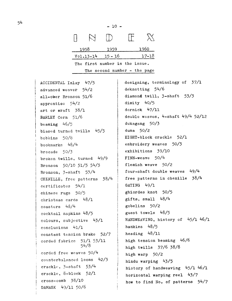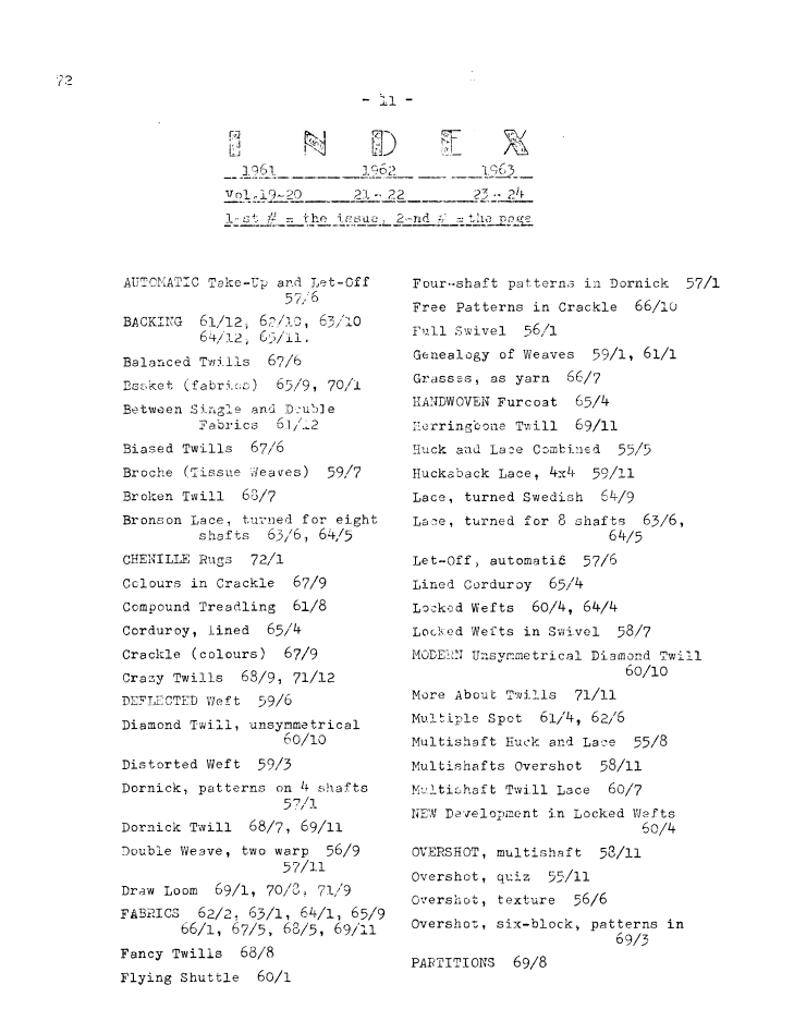Index, ---. Master Weaver, No. 54 November 1960, 3 pages. Note: PDF provided by Judith Combs. By permission. Posted July 15, 2006. SAMPLE PAGE. File size 608 KB PDF