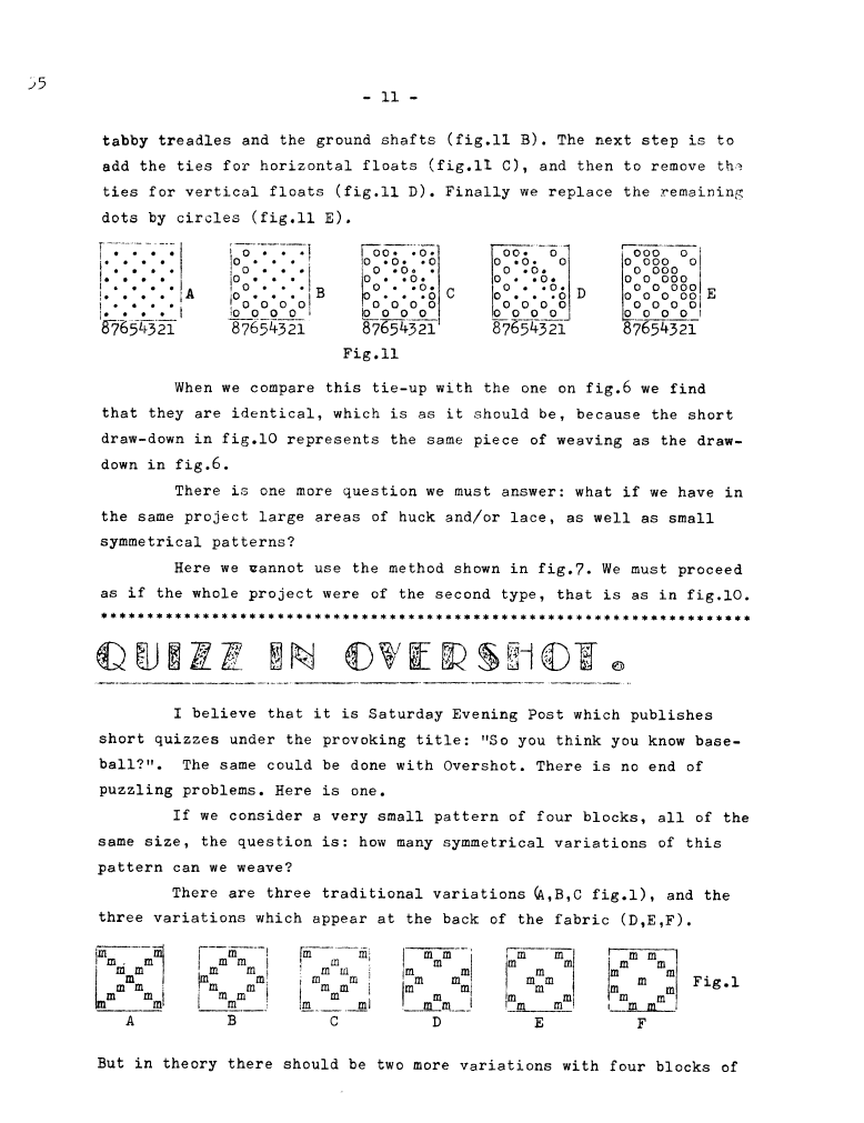 Quizz in Overshot, ---. Master Weaver, No. 55 January 1961, 2 pages. Note: PDF provided by Judith Combs. By permission. Posted July 15, 2006. SAMPLE PAGE. File size 516 KB PDF