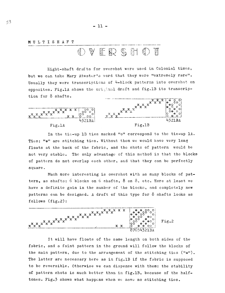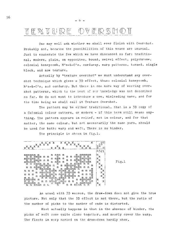 Texture Overshot, ---. Master Weaver, No. 56 March 1961, 3 pages. Note: PDF provided by Judith Combs. By permission. Posted July 15, 2006. SAMPLE PAGE. File size 619 KB PDF