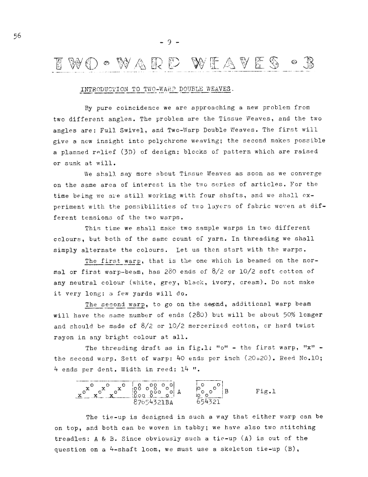 Two-Warp Fabrics 2, ---. Master Weaver, No. 54 November 1960, 2 pages. Note: PDF provided by Judith Combs. By permission. Posted July 15, 2006. SAMPLE PAGE. File size 562 KB PDF