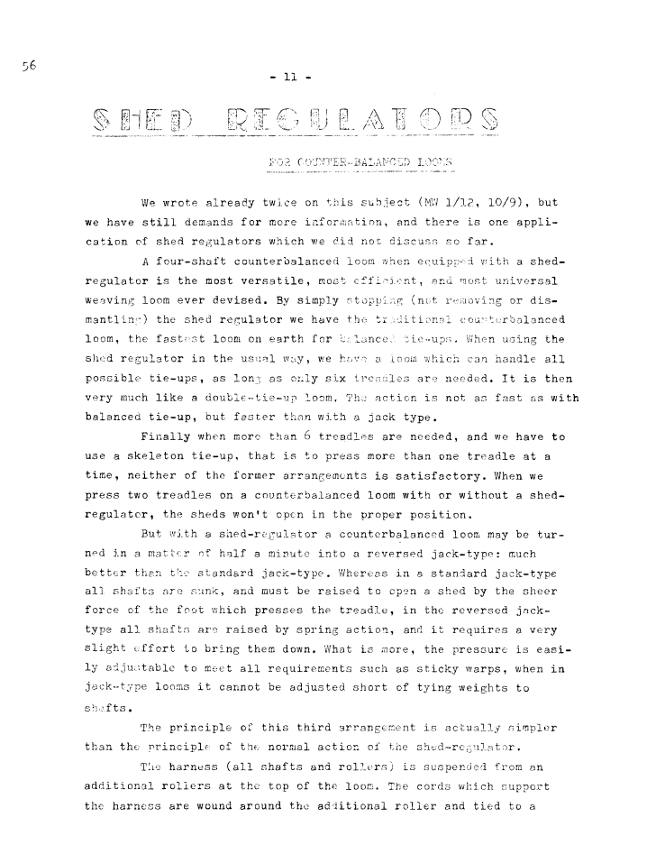 Shed Regulators for Counter-Balanced Looms, ---. Master Weaver, No. 56 March 1961, 2 pages. Note: PDF provided by Judith Combs. By permission. Posted July 15, 2006. SAMPLE PAGE. File size 546 KB PDF