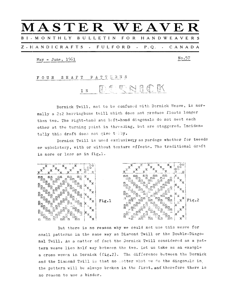 Four Shaft Patterns in Dornick, ---. Master Weaver, No. 57 May 1961, 3 pages. Note: PDF provided by Judith Combs. By permission. Posted July 15, 2006. SAMPLE PAGE. File size 645 KB PDF
