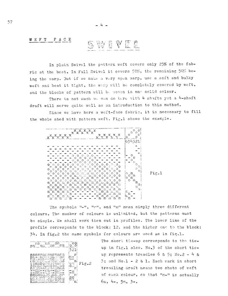Weft Face Swivel, ---. Master Weaver, No. 57 May 1961, 2 pages. Note: PDF provided by Judith Combs. By permission. Posted July 15, 2006. SAMPLE PAGE. File size 561 KB PDF