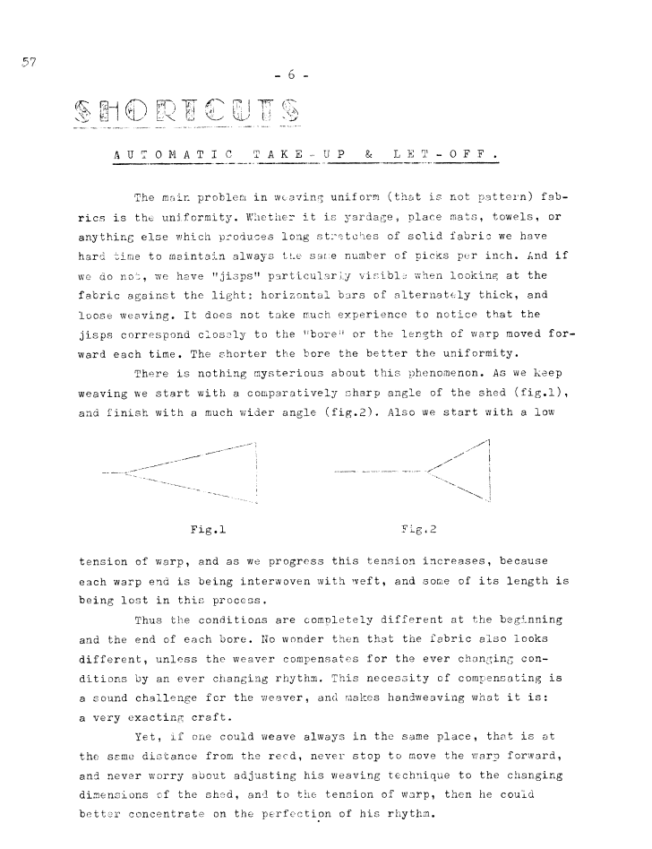 Shortcuts - Automatic Take-Up & Let-Off, ---. Master Weaver, No. 57 May 1961, 5 pages. Note: PDF provided by Judith Combs. By permission. Posted July 15, 2006. SAMPLE PAGE. File size 774 KB PDF