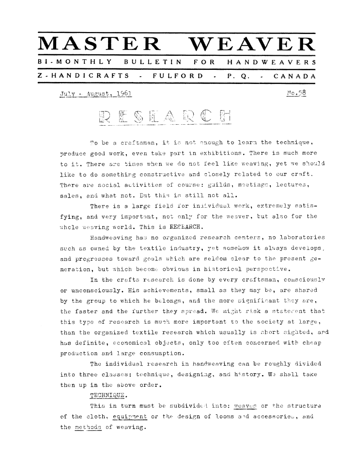 Research, ---. Master Weaver, No. 58 July 1961, 6 pages. Note: PDF provided by Judith Combs. By permission. Posted July 15, 2006. SAMPLE PAGE. File size 916 KB PDF
