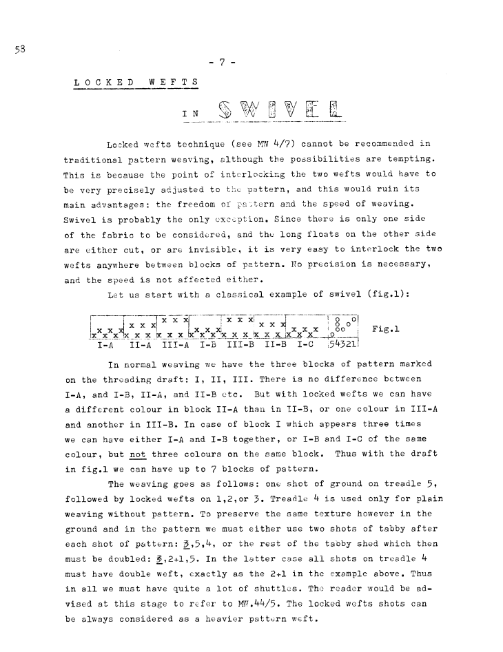Locked Wefts in Swivel, ---. Master Weaver, No. 58 July 1961, 4 pages. Note: PDF provided by Judith Combs. By permission. Posted July 15, 2006. SAMPLE PAGE. File size 734 KB PDF