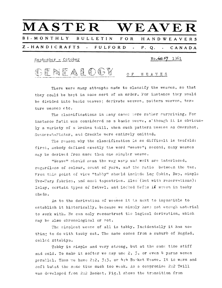 Genealogy of Weaves, ---. Master Weaver, No. 59 September 1961, 2 pages. Note: PDF provided by Judith Combs. By permission. Posted July 15, 2006. SAMPLE PAGE. File size 565 KB PDF