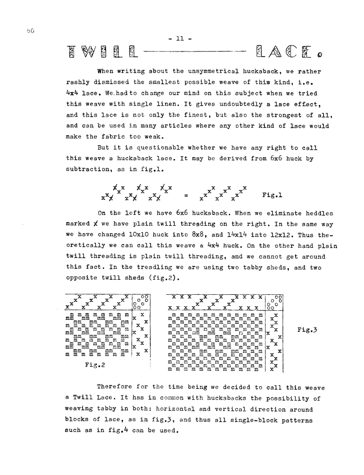 Twill Lace, ---. Master Weaver, No. 59 September 1961, 2 pages. Note: PDF provided by Judith Combs. By permission. Posted July 15, 2006. SAMPLE PAGE. File size 556 KB PDF