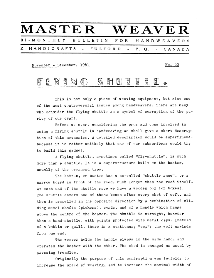 Flying Shuttle, ---. Master Weaver, No. 60 November 1961, 3 pages. Note: PDF provided by Judith Combs. By permission. Posted July 15, 2006. SAMPLE PAGE. File size 601 KB PDF