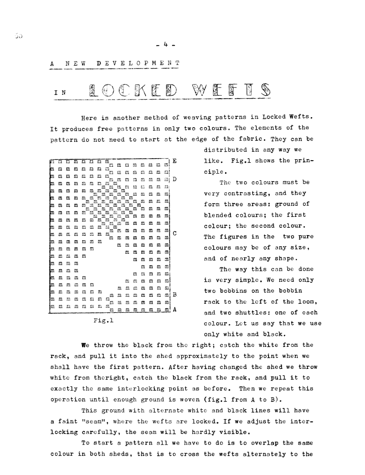 A New Development in Locked Wefts, ---. Master Weaver, No. 60 November 1961, 3 pages. Note: PDF provided by Judith Combs. By permission. Posted July 15, 2006. SAMPLE PAGE. File size 635 KB PDF