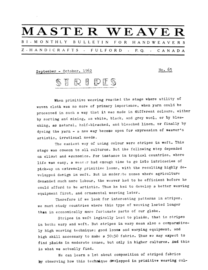 Stripes, ---. Master Weaver, No. 61 September 1962, 3 pages. Note: PDF provided by Judith Combs. By permission. Posted July 15, 2006. SAMPLE PAGE. File size 634 KB PDF