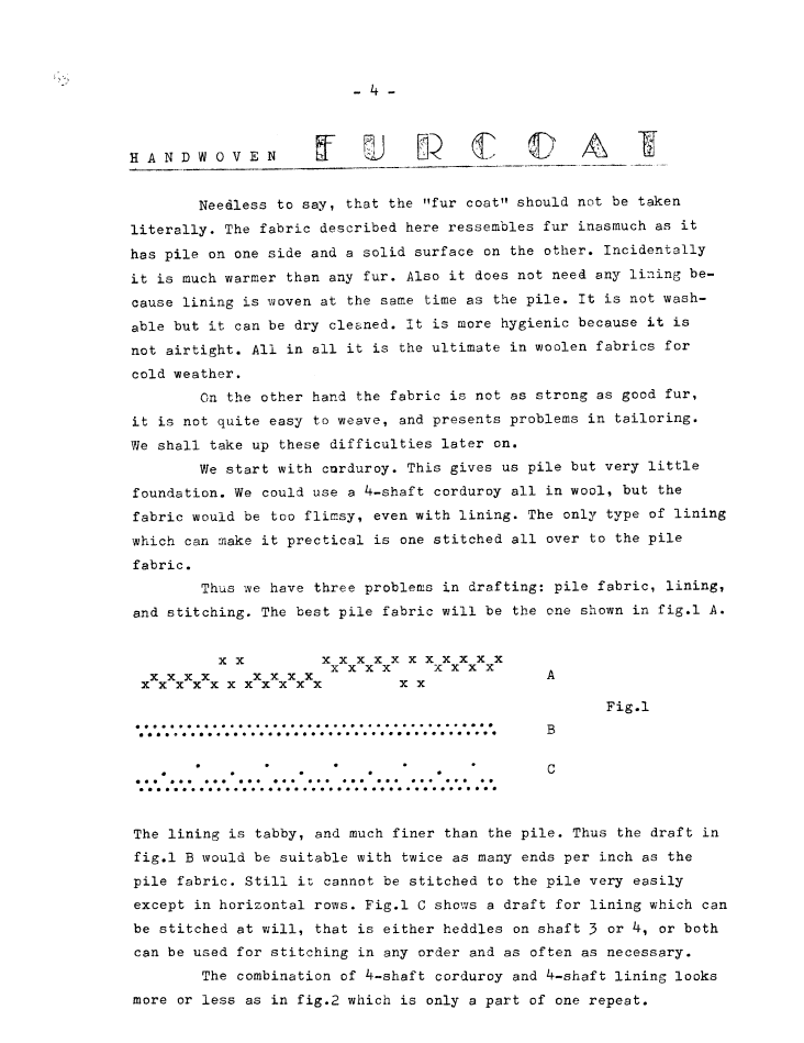 Handwoven Furcoat, ---. Master Weaver, No. 61 September 1962, 5 pages. Note: PDF provided by Judith Combs. By permission. Posted July 15, 2006. SAMPLE PAGE. File size 742 KB PDF