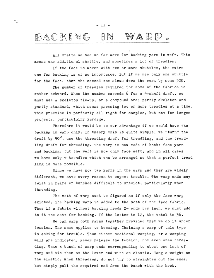 Backing in Warp, ---. Master Weaver, No. 61 September 1962, 2 pages. Note: PDF provided by Judith Combs. By permission. Posted July 15, 2006. SAMPLE PAGE. File size 564 KB PDF