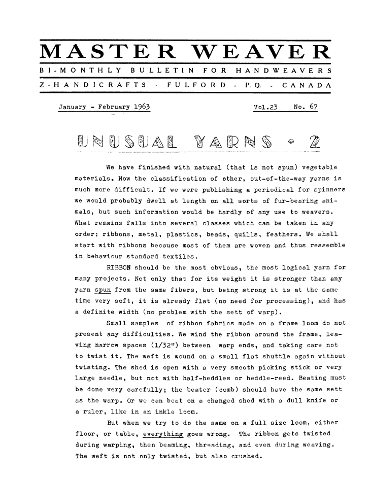 Unusual Yarns - 2, ---. Master Weaver, No. 67 January 1963, 4 pages. Note: PDF provided by Judith Combs. By permission. Posted July 15, 2006. SAMPLE PAGE. File size 672 KB PDF