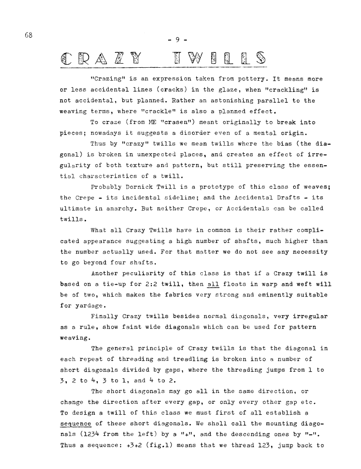 Crazy Twills, ---. Master Weaver, Vol. 23 No. 68 March 1963, 4 pages. Note: PDF provided by Judith Combs. By permission. Posted July 15, 2006. SAMPLE PAGE. File size 715 KB PDF
