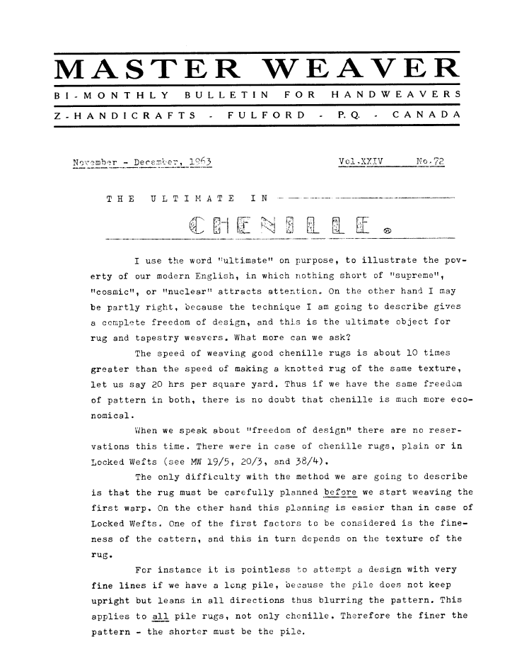 The Ultimate in Chenille, ---. Master Weaver, Vol. 24 No. 72 November 1963, 6 pages. Note: PDF provided by Judith Combs. By permission. Posted July 15, 2006. SAMPLE PAGE. File size 834 KB PDF