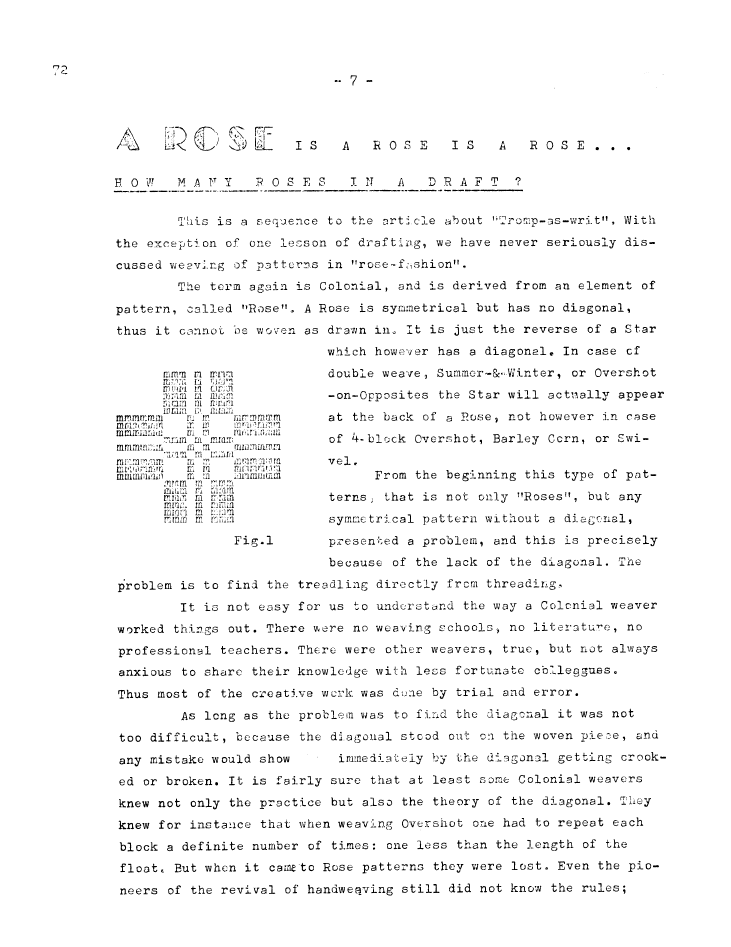 How Many Roses in a Draft?, ---. Master Weaver, Vol. 24 No. 72 November 1963, 3 pages. Note: PDF provided by Judith Combs. By permission. Posted July 15, 2006. SAMPLE PAGE. File size 606 KB PDF