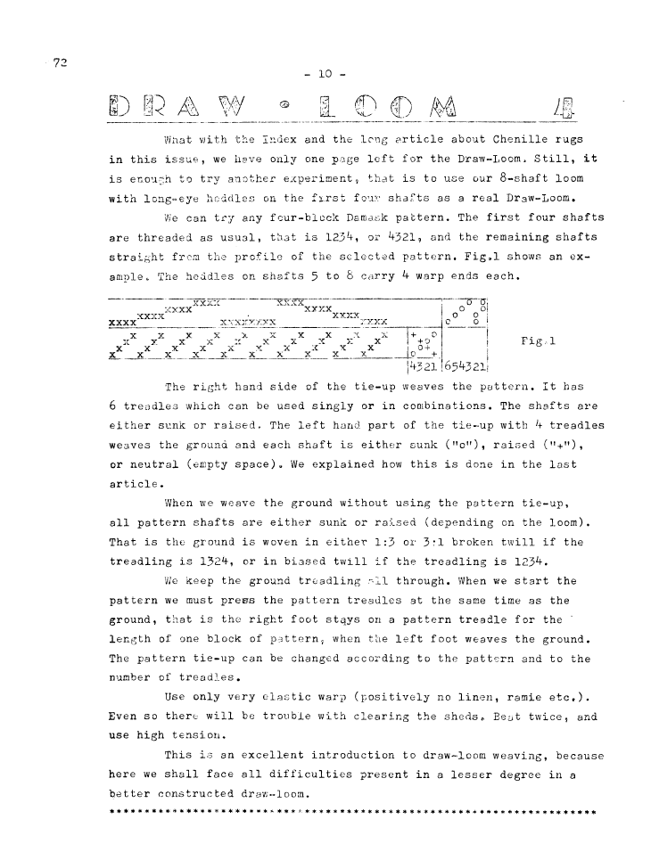 Draw Loom 4, ---. Master Weaver, Vol. 24 No. 72 November 1963, 1 page. Note: PDF provided by Judith Combs. By permission. Posted July 15, 2006. SAMPLE PAGE. File size 464 KB PDF