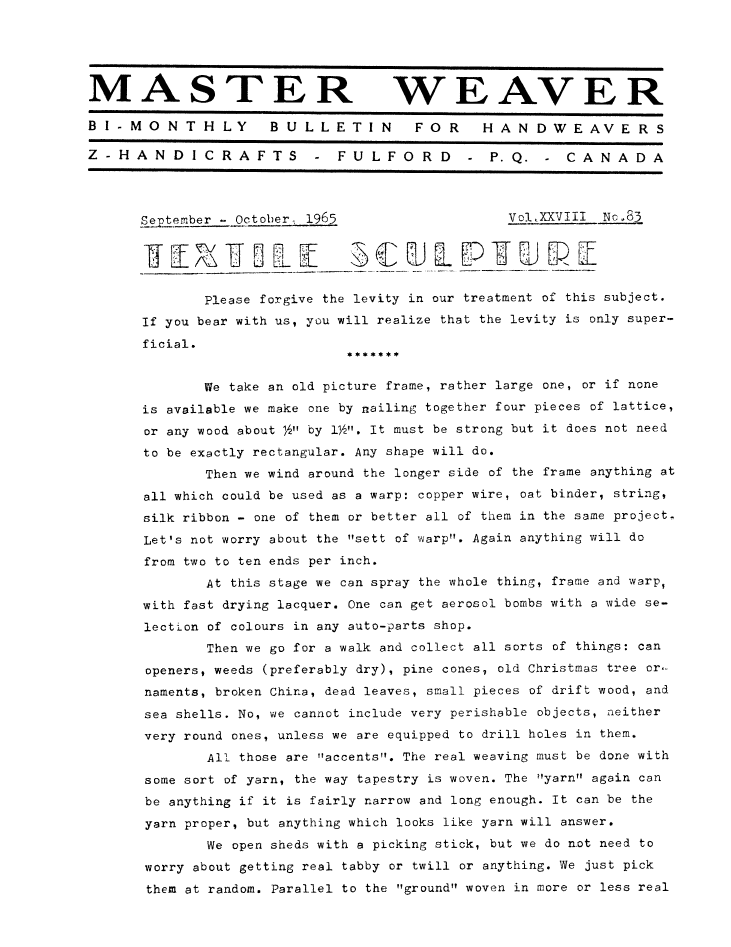 Textile Sculpture, ---. Master Weaver, Vol. 28 No. 83 September 1965, 4 pages. Note: PDF provided by Judith Combs. By permission. Posted July 15, 2006. SAMPLE PAGE. File size 749 KB PDF