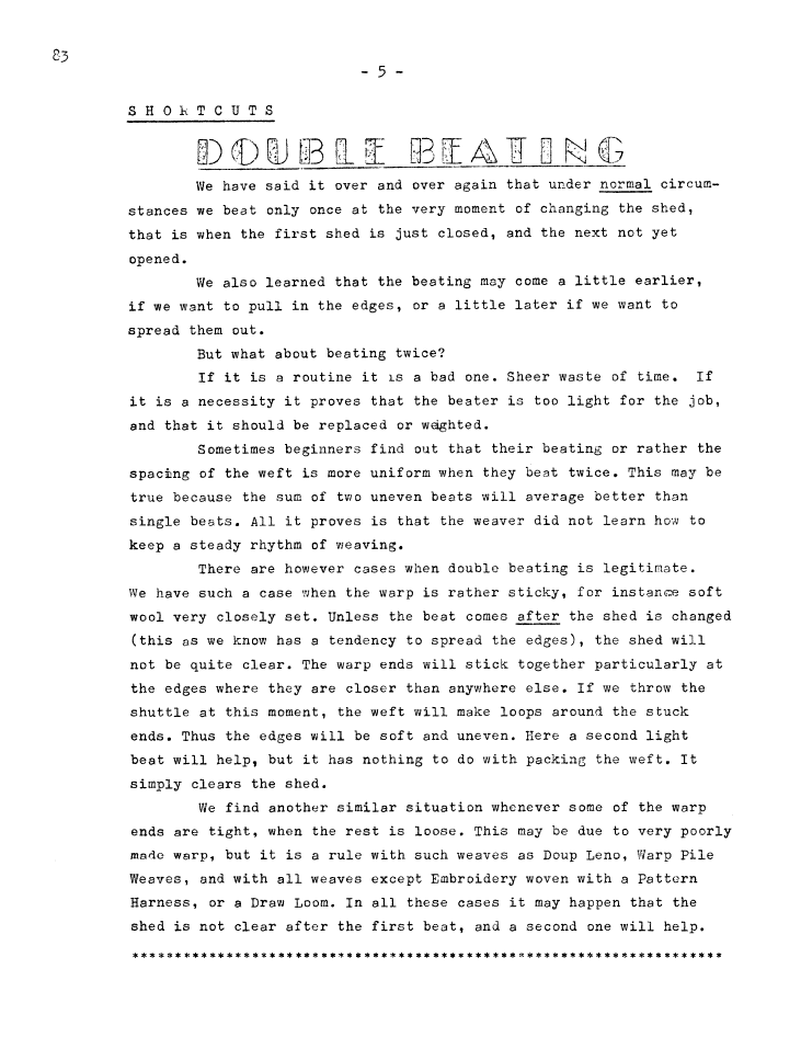 Shortcuts - Double Beating, ---. Master Weaver, Vol. 28 No. 83 September 1965, 1 page. Note: PDF provided by Judith Combs. By permission. Posted July 15, 2006. SAMPLE PAGE. File size 479 KB PDF