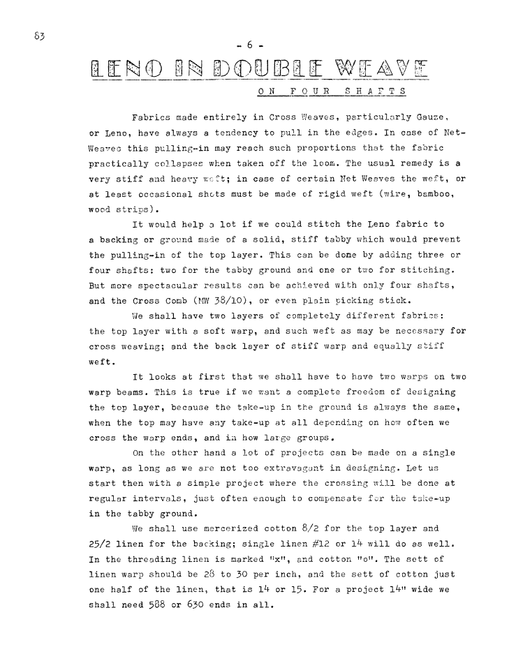 Leno in Double Weave on Four Shafts, ---. Master Weaver, Vol. 28 No. 83 September 1965, 3 pages. Note: PDF provided by Judith Combs. By permission. Posted July 15, 2006. SAMPLE PAGE. File size 651 KB PDF
