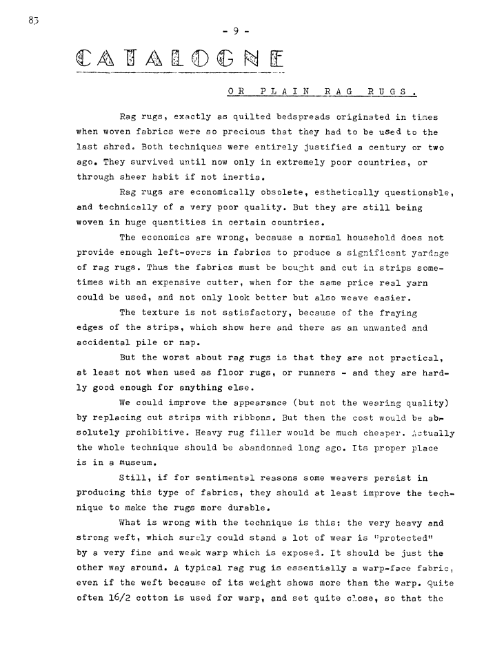 Catalogne or Plain Rag Rugs, ---. Master Weaver, Vol. 28 No. 83 September 1965, 2 pages. Note: PDF provided by Judith Combs. By permission. Posted July 15, 2006. SAMPLE PAGE. File size 566 KB PDF