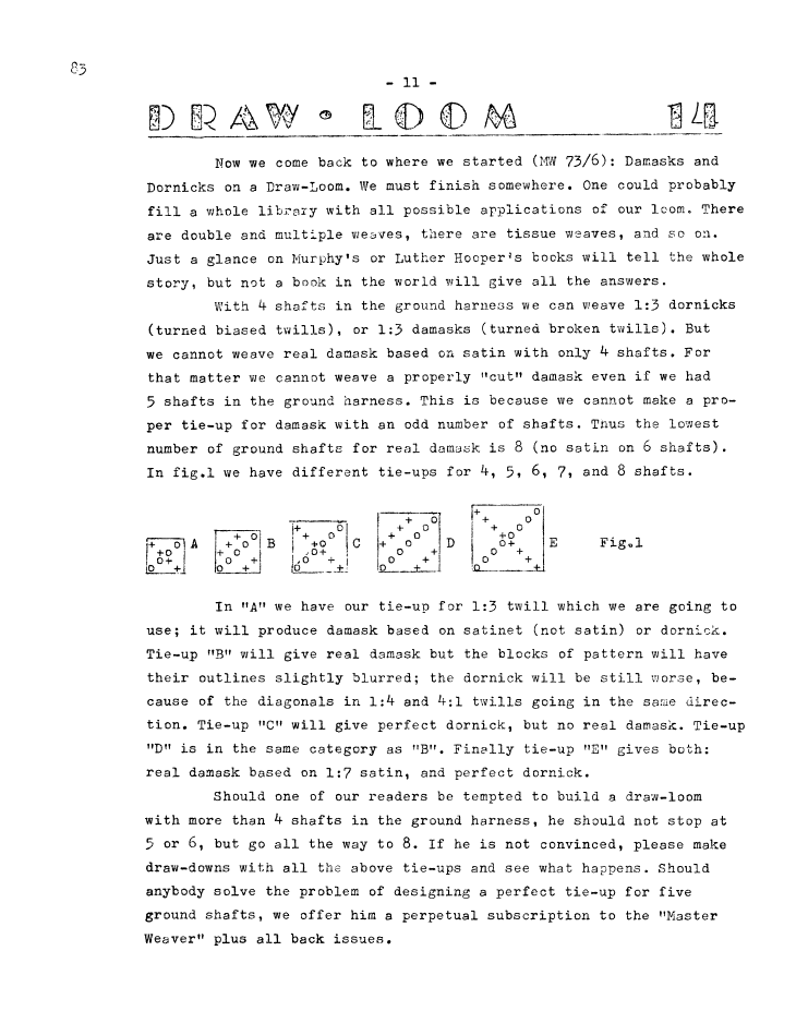 Draw Loom 14, ---. Master Weaver, Vol. 28 No. 83 September 1965, 2 pages. Note: PDF provided by Judith Combs. By permission. Posted July 15, 2006. SAMPLE PAGE. File size 554 KB PDF
