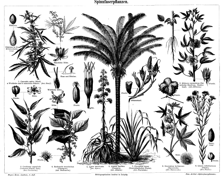 Spinnfaser [Textile Fibers], ---. Meyers Konversations-Lexikon, 1897, 3 pages. Posted July 7, 2003. SAMPLE PAGE. File size 952 KB PDF