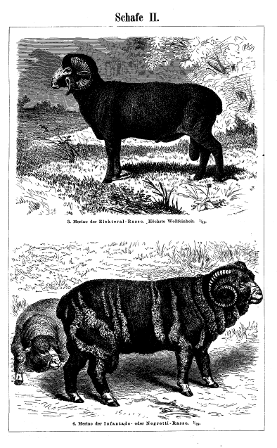 Schaf [Sheep], ---. Meyers Konversations-Lexikon, 1897, 9 pages. Posted July 8, 2003. SAMPLE PAGE. File size 1.6 MB PDF