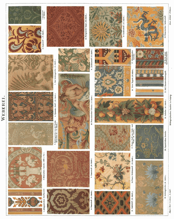 Weben [Weaving], ---. Meyers Konversations-Lexikon, 1897, 6 pages. Posted July 4, 2003. SAMPLE PAGE. File size 1.1 MB PDF