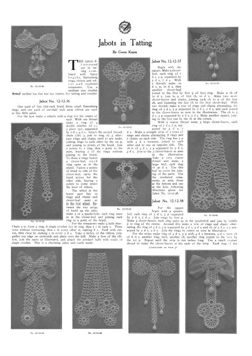 Jabots in Tatting, Keyes, Gwen. Modern Priscilla, December 1912, 2 pages. Note: Reduced to 75% to fit on page. Scanned images provided by Tess Parrish. Posted July 20, 2005. SAMPLE PAGE. File size 776 KB PDF