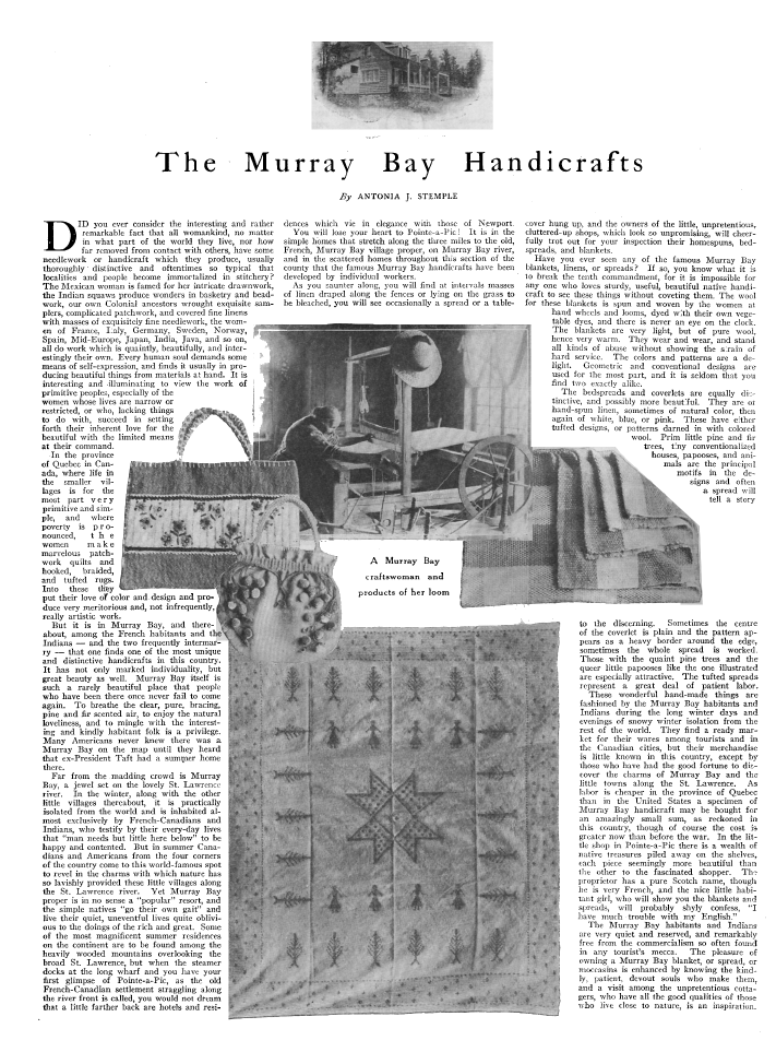 Murray Bay Handicrafts, Stemple, Antonia J. Modern Priscilla, November 1920, 1 page. Note: Reduced to 75% to fit on page. Scanned images provided by Tess Parrish. Posted July 20, 2005. SAMPLE PAGE. File size 1.2 MB PDF