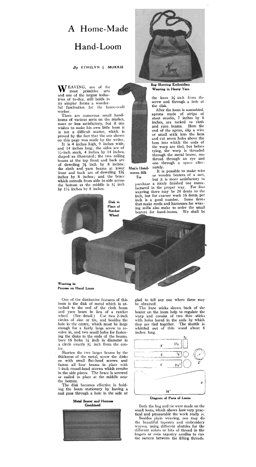 Home-Made Hand-Loom, Morris,Ethellyn J. Modern Priscilla, April 1921, 1 page. Note: Reduced to 75% to fit on page. Scanned images provided by Tess Parrish. Posted July 20, 2005. SAMPLE PAGE. File size 688 KB PDF