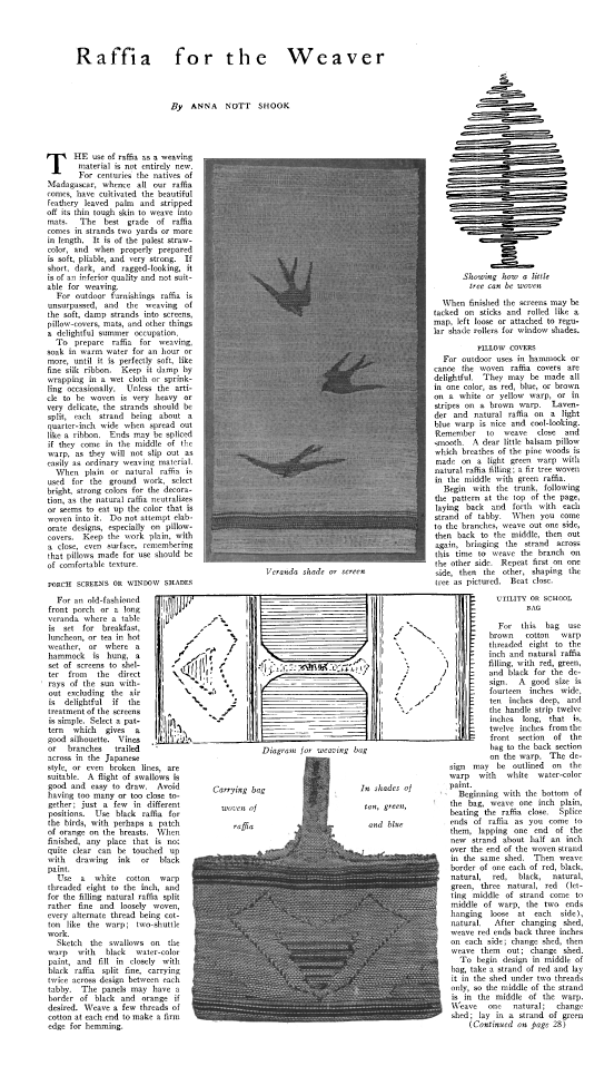 Raffia for the Weaver, Shook, Anna Nott. Modern Priscilla, September 1921, 2 pages. Note: Reduced to 75% to fit on page. Scanned images provided by Tess Parrish. Posted July 20, 2005. SAMPLE PAGE. File size 920 KB PDF