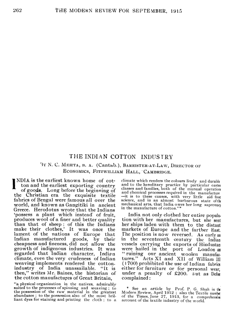 Indian Cotton Industry, Mehta, N. C. The Modern Review (Calcutta), Vol. 18 (September 1915), 6 pages. CD (HWDA08). Posted May 1, 2003. SAMPLE PAGE. File size 1 MB PDF