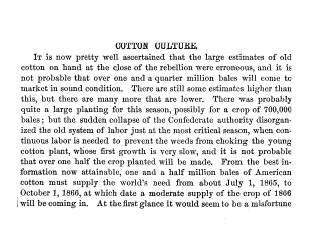 Cotton Culture, ---. Nation, Vol. 1 (1865), 2 pages. CD (HWDA10). Posted May 3, 2004. SAMPLE PAGE. File size 556 KB PDF
