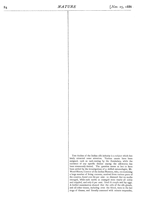 [Decline of the Indian Silk Industry], ---. Nature, Vol. 34, November 25, 1886, 2 pages. CD (HWDA09). Posted June 17, 2004. SAMPLE PAGE. File size 416 KB PDF